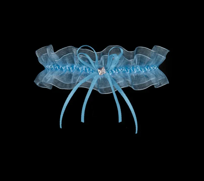 Modrý podvazek z jemného dvojitého šifonu, zdobený saténovou mašlí s třpytivým korálkem, zevnitř podšitý silikonem.