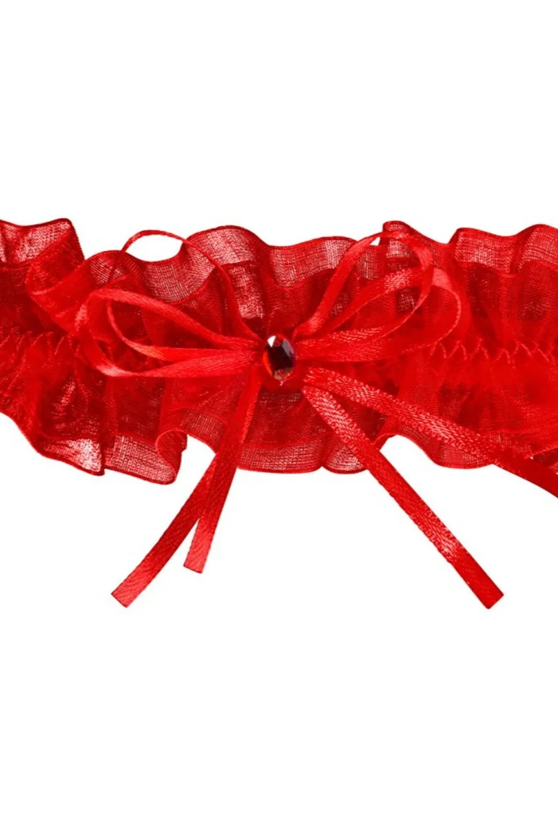 Podvazek v červené barvě, pečlivě vyrobený ze dvou vrstev jemného tylu.
