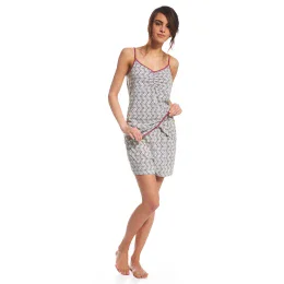 Stylové jarní pyžamo se složitými květinovými vzory. Šedá barva v kombinaci s růžovou a ecru dodává šarm. Halenka s ramínky, mírně přiléhající k tělu. Šortky s gumou.