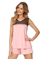 Stylové dvoudílné pyžamo s nápadným průsvitným tylem na ramenou. Tečkovaný tyl, černý, sexy. Pyžamo je vyrobeno z měkké, pružné tkaniny. Halenka má širší ramínka a je dodávána s pohodlnými krátkými kalhotami na gumu.