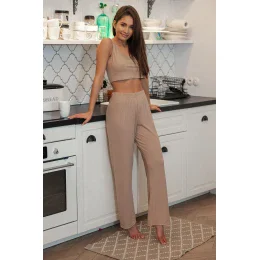 Bez ohledu na roční období je vždy zapotřebí pohodlný a ženský komplet. Laida je řada v barvě karamelu, módní, působivá. Jsou to dlouhé pohodlné kalhoty na gumu a top s širšími ramínky. Můžete je nosit jako komplet nebo je kombinovat se svým oblíbeným základním tričkem či šortkami. Žebrovaná tkanina, pružná a měkká.