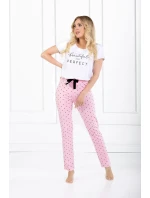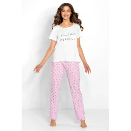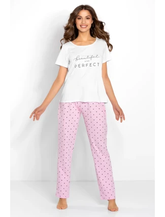 Sladké bílo-růžové pyžamo z nejnovější kolekce polské značky Momenti Per Me v neuvěřitelně ženském stylu. Je vyroben z ušlechtilé bavlny, díky níž je výjimečně měkký, příjemný k pokožce a velmi pohodlný. Tričko s potiskem "Beautiful and Perfect" vás jemně naladí do dobré nálady a dlouhé, tvarované, světle růžové kalhoty pokryté drobnými černými puntíky celý styling dokonale dotvoří. Sladké a sexy!