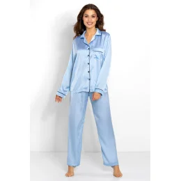 Classic Look je vysoce kvalitní dámské pyžamo vyrobené z prvotřídního saténu, tzv. hedvábného saténu, díky němuž potěší svou hedvábnou jemností a nadprůměrnou měkkostí. Rozdíl na své pleti pocítíte okamžitě. Pyžamo vypadá fenomenálně a nesmírně žensky. Halenka se zapíná na knoflíky, má kapsu a elegantní límeček, okraje halenky zdobí stylové černé lemování. Jemná modrá tkanina s jemným perleťovým leskem. Dlouhé, volné, tvarované kalhoty na měkké gumě. Ozdobná mašle v pase. Polská značka Momenti Per Me. Vysoká kvalita.