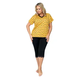 Pyžamo Queen 3/4 z řady Plus Size by Donna je kombinací měkké viskózy vysoké kvality, promyšleného, pohodlného střihu a poutavého designu. Souprava se skládá ze vzorované halenky s krátkými rukávy, zdobené ušlechtilou černou krajkou ve výstřihu, a ideálně sladěných hladkých kalhot ve 3/4 délce s krajkovým lemem ve spodní části. Návrh je šitý až do velikosti 6XL.