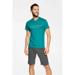 Pánské letní pyžamo sestávající z trička s krátkým rukávem a volných šortek. Košile s výstřihem do V, šortky se zavazováním na šňůrku. Vše je zabaleno v krabici. Složení materiálu: košile 100% bavlna, kalhoty 55% bavlna, 45% polyester.