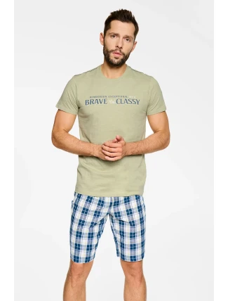 Pánské letní pyžamo sestávající z trička a šortek. Tričko z měkkého bavlněného úpletu s krátkými rukávy. Šortky z jemné kostkované látky se stahovací šňůrkou v pase. Rozměry