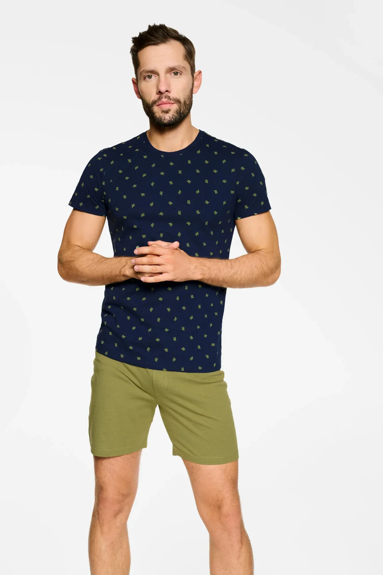 Pohodlné pánské pyžamo pro každodenní nošení i na cesty. Dvoudílná souprava se skládá z trička s krátkým rukávem a šortek pod kolena. Celá souprava je vyrobena z kvalitní bavlny příjemné na dotek, která zajistí pohodlný spánek. Po celém tričku jsou natištěny malé kaktusy v barvě šortek. Hladký lem má elastický pásek, který dobře padne.