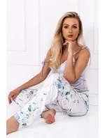 Dámské pyžamo sestávající z trička a dlouhých kalhot. Halenka bez ramínek se špičatým výstřihem. Dlouhé kalhoty s ozdobnou mašlí. Vázaná ramínka, kalhoty s potiskem. Pyžamo z látky příjemné na dotek.