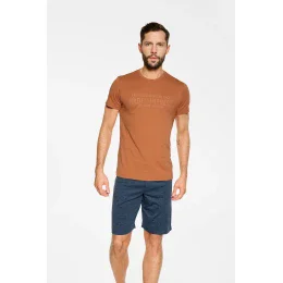 Pánské pyžamo sestávající z trička a šortek. Tričko s krátkým rukávem a nápisem na přední straně. Krátké šortky se stahovací šňůrkou v pase.