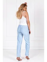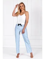 Dámské pyžamo sestávající z trička a dlouhých kalhot. Tričko s vázanými ramínky, špičatý výstřih. Volné kalhoty s ozdobnou mašlí v pase.