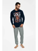 Pánské pyžamo sestávající z mikiny a dlouhých kalhot. Halenka s dlouhými rukávy a nápisem na přední straně. Dlouhé kalhoty se šňůrkami na zavazování. Pyžamo volného, pohodlného střihu, vyrobené z měkké tkaniny.