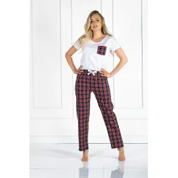 Dámské pyžamo sestávající z halenky a dlouhých kalhot. Halenka s krátkými rukávy a kapsou na přední straně. Dlouhé kalhoty volného, pohodlného střihu. Souprava je ideální také jako domácí oblečení.