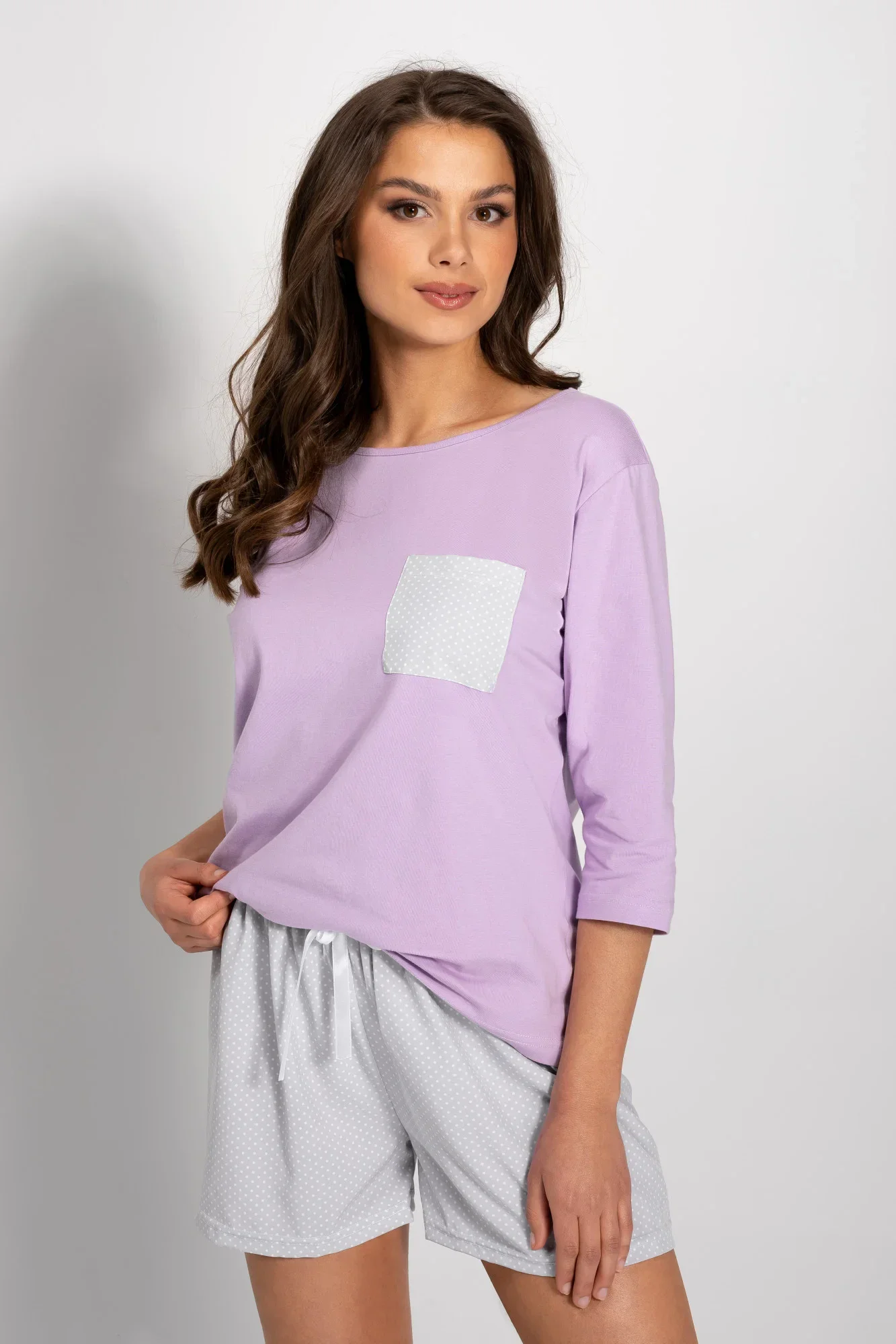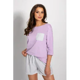 Dámské pyžamo sestávající z halenky a šortek. Halenka s 3/4 rukávy, s kapsou na přední straně. Šortky s elastickým pasem a ozdobnou mašlí.