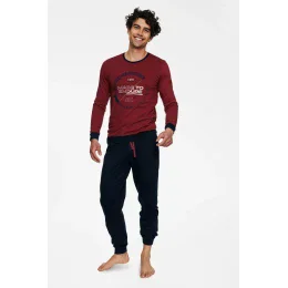 Pohodlné dvoudílné pánské pyžamo HENDERSON BOLT vyrobené z měkké bavlny příjemné na dotek. Souprava se skládá z trička s dlouhým rukávem a dlouhých kalhot. Tričko zdobí grafika s nápisem odkazujícím na název a myšlenku značky. Hladké kalhoty mají volný a pohodlný střih. Manžety, lem košile a nohavice jsou zakončeny širokým lemem. Sada bude ideální po celý rok.