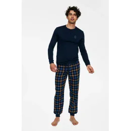 Dvoudílné pánské pyžamo HENDERSON TRADE je vyrobeno ze 100% bavlny pro pohodlný a klidný spánek. Hladká, jednoduchá halenka s dlouhými rukávy má kulatý výstřih se zapínáním na tři knoflíky a rukávy a spodní lem zakončené širokým žebrovaným lemem. Kostkované kalhoty volného střihu se stahovací šňůrkou v pase a manžetami u kotníků se hodí na doma i ven.