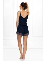 Krásné dámské pyžamo z příjemné viskózy Momenti Per me Daphne. Dvoudílná tmavě modrá souprava s košilkou na tenkých zavazovacích ramínkách. Výstřih ve tvaru písmene V zdobí jemná, elegantní krajka. Spodní díl tvoří volné, krátké šortky s nohavičkami zakončenými proužky krajky. V pase je pružný pásek s drobnou saténovou mašličkou. Vysoce kvalitní pyžamo, měkké jako peříčko a velmi příjemné na nošení.