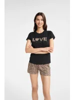 Dámské dvoudílné pyžamo Boutique na léto je komplet ušitý ze 100% bavlny. Souprava se skládá z trička s krátkým rukávem a boxerek. Celá souprava je udržovaná v odstínech černé a karamelově hnědé, zatímco šortky a nápis na tričku mají zvířecí potisk. Jednoduchý, klasický střih a mělký výstřih trička zajišťují, že se oblečení pohodlně obléká i svléká. Dámské pyžamo Boutique bude ideální pro teplejší noci. Zajímejte se o tento model, pokud oceníte klasické střihy a prodyšné, přírodní materiály.