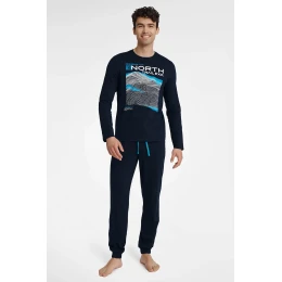 Pánské pyžamo sestávající z trička a kalhot. Tričko s dlouhými rukávy a půlkulatým výstřihem. Dlouhé kalhoty s gumou a zavazováním v pase.