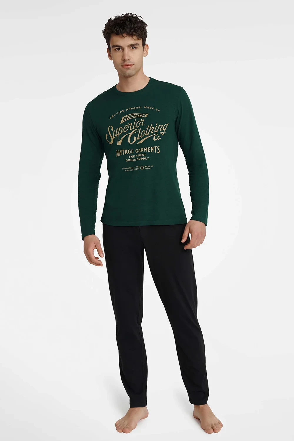 Pánské pyžamo sestávající z trička a kalhot. Tričko s dlouhými rukávy a půlkulatým výstřihem. Dlouhé kalhoty s elastickým pasem.