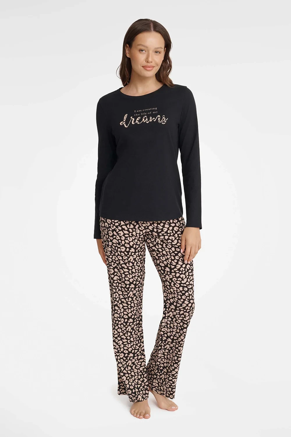 Dámské dvoudílné pyžamo je souprava, která vám umožní spojit módu a pohodlí. Vrchní část soupravy tvoří černá halenka s dlouhými rukávy a půlkulatým výstřihem. Na přední straně je nápis. Spodní část soupravy tvoří kalhoty s volnými nohavicemi a pružným pasem.