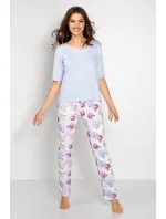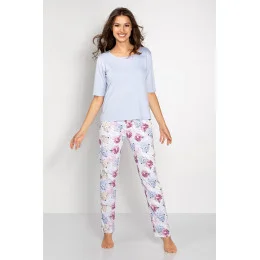 Elegantní a stylové dámské pyžamo. Halenka s krátkými rukávy a půlkulatým výstřihem. Dlouhé kalhoty s elastickým pasem. Navrženo a ušito v Polsku.