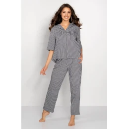 Jednoduché, ale elegantní kostkované dámské pyžamo. Košile s krátkým rukávem a límečkem na knoflíky. Dlouhé kalhoty s nakládanými kapsami a zavazováním v pase.