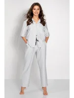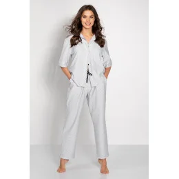 Toto dámské pyžamo v sobě spojuje eleganci, pohodlí a jedinečný design. Košile má výstřih do V a pro větší eleganci se zapíná na knoflíky. Měkká a vzdušná tkanina poskytuje maximální pohodlí a její hypoalergenní vlastnosti zajistí, že nedráždí pokožku. Košile i kalhoty mají kapsy, což jim dodává na praktičnosti. Ženský styl a oversize střih poskytují volný a pohodlný střih. Pyžamo je vyrobeno z jemné tkaniny a zakončeno ozdobným límcem. Pyžamo má navíc tlumené módní barvy a vkusnou mašli v pase. Jedná se o polský výrobek nejvyšší kvality. Díky dvoudílné sadě je toto pyžamo ideálním dárkem pro vás nebo jinou osobu. Jeho elegantní střih podtrhne eleganci a jedinečnost každé ženy.
