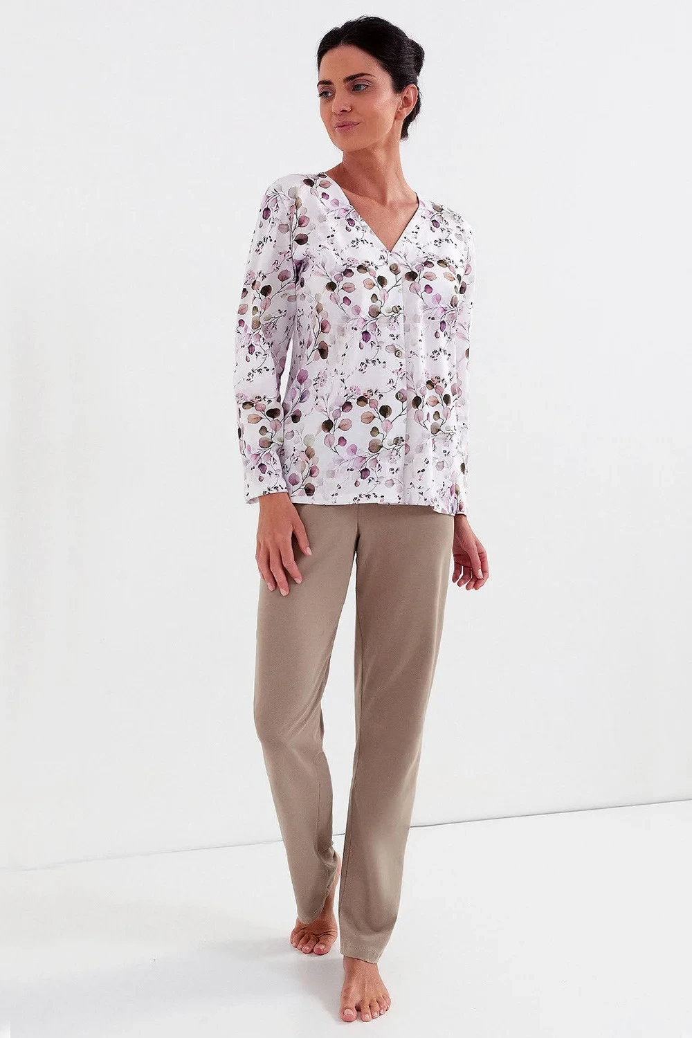 Dámské pyžamo z bavlněného žerzeje. Krásný botanický vzor v odstínech fialové a zelené. Rozepínací halenka s perleťovými knoflíky, s dlouhými rukávy. Doplněno klasickými dlouhými kalhotami z pohodlného úpletu.
