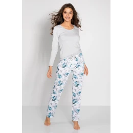 Toto krásné dámské pyžamo s halenkou s dlouhými rukávy v sobě spojuje pohodlí, eleganci a péči o zdraví. Má certifikát OEKO-TEX Standard 100, který dokazuje, že je hypoalergenní a bezpečné pro pokožku. Výstřih ve tvaru písmene U, zakončený jemným lemováním, dodává halence ženský a elegantní charakter. Elegantní lemy (lemování) a jemné barvy dělají z tohoto pyžama nejen pohodlné oblečení na spaní, ale také stylový kousek oblečení. Dlouhé kalhoty, které zdůrazňují siluetu, mají v pase gumu, která zaručuje volnost pohybu a pohodlné nošení. Jsou vyrobeny z přírodních materiálů, které se po vyprání nedeformují a nedráždí pokožku. Vysoká kvalita potištěné látky zajišťuje odolnost a estetiku. Jedná se nejen o praktickou soupravu pro každodenní nošení, ale také o perfektní nápad na dárek. Design a výroba v Polsku zaručují nejen elegantní střih, ale také solidnost zpracování.