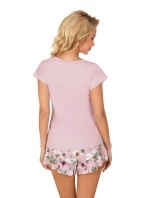 Skládá se z jednobarevného trička a vzorovaných šortek, pyžamo Nicola 1/2. Tričko z olivové nebo světle růžové lehce lesklé látky. Výstřih není příliš hluboký, s výstřihem do V, zakončený širokým řasením. Šortky z růžové bavlny, po celé délce zdobené různobarevnými květy. Široký volán v horní části nohavic dělá šortky zvlněné jako sukni. Vyrobeno v Polsku.