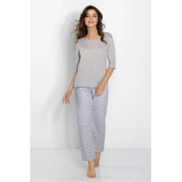 Zveme vás k objevení jedinečného dámského pyžama, které v sobě spojuje jedinečné pohodlí a jemný šarm. Tato dvoudílná kompozice byla vytvořena pro ženy, které se chtějí cítit výjimečně jak během spánku, tak ve chvílích odpočinku. Halenka s 3/4 rukávy a výstřihem do U potěší svou jemností a ženskou elegancí. Výstřih byl navíc olemován lemovkou, která celku dodává jemnost. Jemné barvy pyžama podtrhují jeho lehkost a půvab. Vrchní část pyžama má volný střih, díky němuž je jeho nošení mimořádně pohodlné. Dlouhé kalhoty s elastickým pasem zaručují volnost pohybu a perfektní přizpůsobení. Tato pyžama jsou nejen designově úžasná, ale byla vytvořena s ohledem na bezpečnost a pohodlí. Má certifikát OEKO-TEX Standard 100, který potvrzuje, že použité materiály neobsahují látky škodlivé pro pokožku. Měkká a vzdušná tkanina se navíc po vyprání nedeformuje a nezpůsobuje podráždění. Polský výrobek, navržený a ušitý s důrazem na nejmenší detaily, představuje vysokou kvalitu zpracování. Dvoudílná souprava je nejen dokonalým oblečením na večerní procházku, ale také perfektním dárkem pro každou ženu, která ocení pohodlí a eleganci.