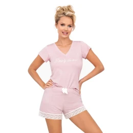 Vítejte v útulném světě relaxace a pohodlí v našem jedinečném dámském pyžamu. Toto pyžamo se skládá z měkké halenky s krátkým rukávem, která vypadá jedinečně díky decentnímu zdobení, nápisu na přední straně, který dodává nádech originality. Výstřih do V dodává jemnost a ženskost. Spodní část pyžamových šortek zdobí jemná krajka, která dodává jemnost a ženský půvab. Šortky jsou krátké, poskytují volnost pohybu a pohodlně se nosí. Volný, pohodlný střih zajistí, že se budete cítit uvolněně a pohodlně po celou noc. Pyžamo je vyrobeno z kvalitní, měkké a prodyšné tkaniny, která vám zajistí příjemný a svěží pocit během spánku. Navíc jako polský výrobek si můžete být jisti jeho solidností a pečlivým zpracováním. Pyžamové šortky jsou bez kapes, což jim dodává na eleganci a minimalistickém vzhledu. Jejich tlumené barevné provedení jim dodává univerzálnost, takže je lze snadno sladit s různými outfity. V pase mají elastický pás, který zajistí dokonalé přizpůsobení vaší postavě, a také ozdobnou mašli, která jim dodá šarm a jemnost. Toto pyžamo je vyrobeno z měkké viskózy, která je nejen mimořádně příjemná na pokožce, ale také se snadno udržuje a ošetřuje. Nasajte v něm chladné večery, relaxujte v pohodlí domova a užívejte si výjimečného komfortu a stylu.