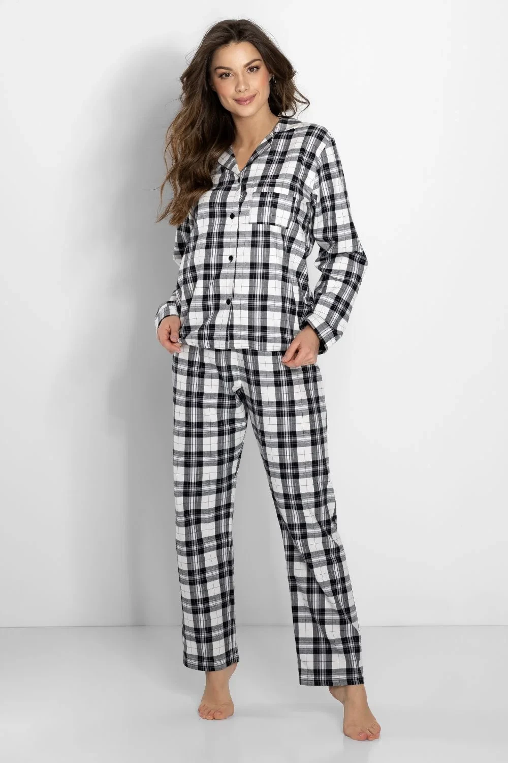 Dámská pyžama navržená a ušitá v Polsku představují eleganci a pohodlí v jednom. Souprava se skládá z trička s dlouhým rukávem a dlouhých kalhot. Košile má výstřih do V, límeček, rukávy zakončené manžetami, volný oversize střih a zapíná se na knoflíčky. Kalhoty mají rovněž volný, pohodlný střih a elastický pas. Pyžamo je vyrobeno z přírodních materiálů a umožňuje pokožce dýchat. Kvalitní zpracování zajišťuje dlouhou životnost. Vyhněte se sušení v sušičce. Díky jemnému a elegantnímu designu je pyžamo ideální také jako dárek.
