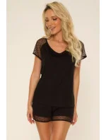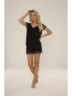 Vsadíte na pohodlí v ženském provedení s touto výjimečnou dámskou pyžamou, která kombinuje klasický střih s originálním akcentem. Horní část je košile s elegantním límcem a praktickou kapsou na hrudi, místo tradičních knoflíků se používá moderní šňůrka, která dodává celku lehkost a půvab. Vyrobena z měkké, prodyšné látky s potiskem, pyžamo se skvěle hodí jak na léto, tak na teplejší jarní či podzimní noci. Rukávy délky 7/8 zajišťují pohodlí a volný střih neomezuje pohyb. Součástí jsou krátké kalhoty se širokým elastickým pasem, které zaručují ideální přizpůsobení a maximální pohodlí. Celý set je zabaleno do praktického fóliového sáčku, ideální i jako dárek.