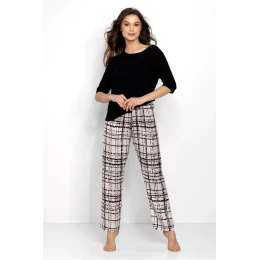 Elegantní dámské pyžamo, ideální také jako dárek. Halenka s 3/4 rukávy a výstřihem do U zaujme stylovým oversize střihem pro pohodlí a volnost pohybu. Volný top ladí s pohodlným střihem dlouhých kalhot, které mají v pase gumu zaručující pohodlí během spánku. Pyžamo je vyrobeno z jemné viskózy a elegantního saténu, takže je příjemné na dotek a elegantní. Kvalitní potisk látky na kalhotách dodává pyžamu zvláštní kouzlo. Toto dvoudílné pyžamo, které bylo navrženo a ušito v Polsku, je synonymem pohodlí a elegance.