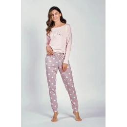 Dámské pyžamo ideální na každý večer i jako domácí oblečení. Blůza s dlouhými rukávy v jemných barvách má půlkruhový výstřih a nápisy, které jí dodávají jemný půvab. Je vyrobena z měkké a vzdušné tkaniny a poskytuje pohodlné nošení. Dlouhé kalhoty s elastickým pasem se dokonale přizpůsobí postavě a nabízejí volnost pohybu. Celá souprava je zabalena v praktickém pouzdře, takže se skvěle hodí jako dárek. Toto pyžamo, navržené a ušité v Polsku, v sobě spojuje vysokou kvalitu a výjimečný styl.