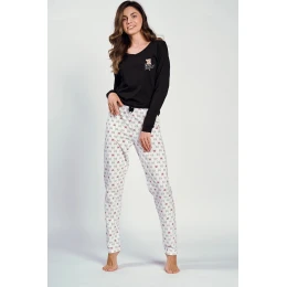 Dámské pyžamo, které se hodí na každou noc, se skládá z halenky s dlouhým rukávem a kalhot. Halenka má půlkruhový výstřih a jemný potisk v horní části, volný a pohodlný střih pro volnost pohybu. Je vyrobena z měkké a vzdušné tkaniny, která je příjemná na dotek. Šortky mají roztomilý potisk a dlouhé nohavice a absence kapes podtrhuje minimalistický design. Elastický pas zajišťuje pohodlné nošení a ozdobná mašle dodává elegantní nádech. Pyžamo je baleno v praktickém sáčku, což z něj činí ideální nápad na dárek.