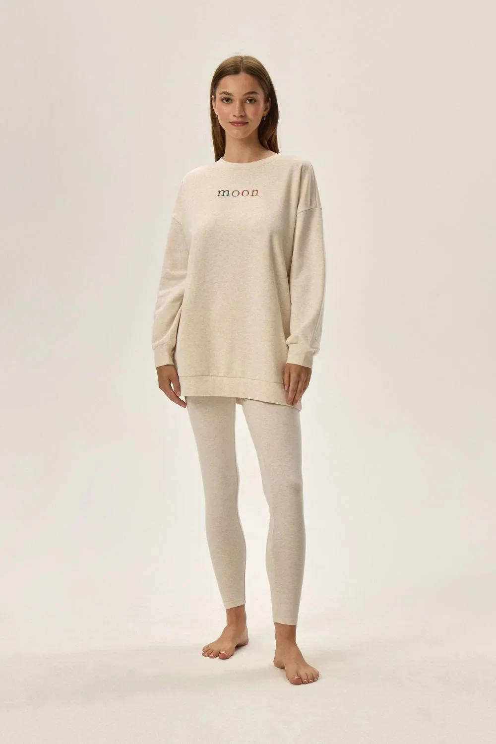 Kompletní set Fune je dvoudílná sada vyrobená z příjemné pleteniny. Sestává z volného vrchu s nápisem a dlouhými rukávy a legínů sahajících až po kotníky. Legíny mají široký gumový pas. Pokud jste milovnicí pohodlného oblečení v světlé, neutrální barvě, tento dámský oděv v barvě béžové se vám bude líbit. Složení: Vrchní část: 70% bavlna, 30% polyester; Spodní část: 77% bavlna, 18% polyester, 5% elastan.
