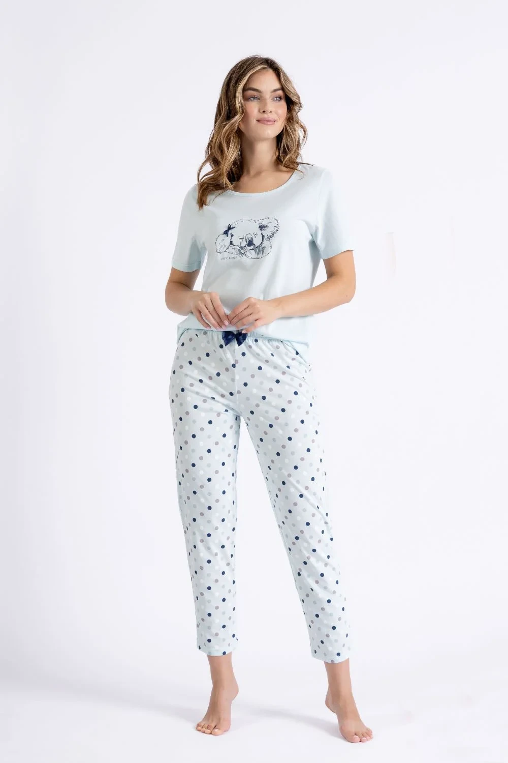 Dámská pyžama spojující pohodlí a jemný styl. Tričko s krátkým rukávem a kulatým výstřihem, zdobené jemným potiskem, zajistí pohodlný střih, ideální pro noční odpočinek. Celý komplet je balen do praktického pytlíku, což ho činí také skvělým dárkem. Kalhoty o délce 7/8, také s potiskem, bez kapes, mají pravidelný střih, který jemně přiléhá k tělu. Kultivované barvy a ozdobná mašlička v pasu zdůrazňují eleganci této pyžamy. Pohodlný elastický pas zajistí ideální přizpůsobení.
