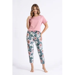 Dámský pyžamový set spojující pohodlí a jemný šarm. Tričko s krátkým rukávem a Výstřihem s kapsou na hrudi zdobenou jemnou mašlí má volný a pohodlný střih, ideální pro spaní. Vyrobena z měkké a prodyšné látky, poskytuje plný komfort při nošení. Celý set je balený v taštičce, což z něj dělá také skvělý dárek. Kalhoty s délkou 7/8 s potiskem bez kapes mají pravidelný střih, který se přizpůsobí postavě. Elastický pás a ozdobná mašle dodávají pyžamu eleganci a šarm.
