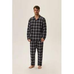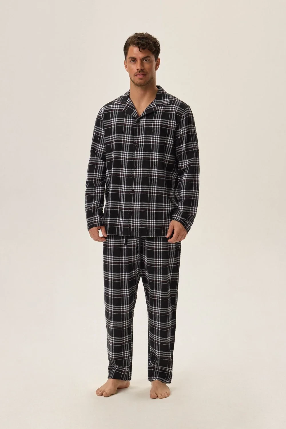 Pyžamo mužské HONOR 2 je klasická, dvoudílná sada s nadčasovým střihem. Dlouhé kalhoty s volným střihem poskytují pohodlí během nočního odpočinku. Stylový vzhled zajišťuje košile s límečkem a dlouhými rukávy. Pyžamo má neutrální, černou barvu a křížový vzor s velkými okny. Pohodlí zaručuje 100% bavlna, která je příjemná na dotek a dobře propouští vzduch.