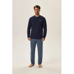 Elegantní tmavě modrá pyžama Hale je nabídkou pro muže, kteří ocení pohodlí stejně jako styl, i v noci! Měkký tmavě modrý svetr s casual střihem se zapíná pod krkem na knoflíky - po rozepnutí ukazuje zdobný geometrický lem. Další ozdobou jsou švy na ramenou a značková nášivka na hrudi. Soupravu doplňují světlejší kalhoty s jemným vzorem a volným, mírně se zužujícím střihem. Rozměry: Velikost M: Prsa 94-98 cm, boky 98-102 cm Velikost L: Prsa 98-102 cm, boky 102-106 cm Velikost XL: Prsa 102-106 cm, boky 106-110 cm Velikost XXL: Prsa 106-110 cm, boky 110-114 cm Velikost XXXL: Prsa 114-120 cm, boky 114-118 cm