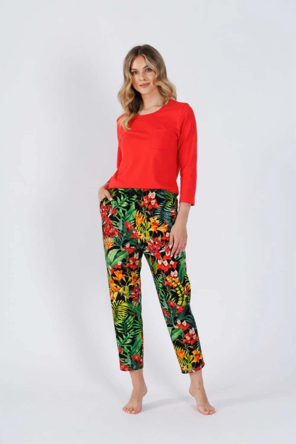 Dámský pyžamový set spojující pohodlí a styl. Košile s rukávem 7/8, s jemným polokruhovým výstřihem, je vyrobena z hladké a příjemné látky. Volný, pohodlný střih zajistí pohodlí a volnost pohybu, a další kapsy dodají funkčnosti a kouzla. Kalhoty s délkou 7/8 jsou zdobeny moderním potiskem a jsou ukončeny elastickým páskem v pasu, což zajistí ideální přizpůsobení. Celkově jde o kombinaci elegance a pohodlí, ideální na relaxační večer nebo klidný den doma.