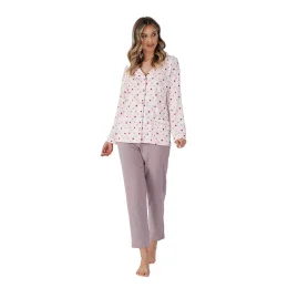 Přeměňte noc v okamžik luxusu s naším elegantním dámským pyžamem. Košile s dlouhým rukávem je pečlivě dokončena elegantním pipingem, který jí dodává třídu a sofistikovanost. Má praktické kapsy po stranách, které jsou jak stylové, tak funkční. Volný střih košile zajistí maximální pohodlí a měkká, prodyšná tkanina ji činí ideální pro relaxaci. 7/8 kalhoty jsou jednoduché a pohodlné, bez kapes pro minimalistický vzhled. Elastický pás zajistí dokonalé přizpůsobení a pohodlí. Košile se zapíná na knoflíky, což jí dodává elegantní charakter. Ideální na večerní relaxační chvíle nebo jako dárek pro blízkou osobu, toto pyžamo spojuje eleganci a pohodlí, které si zasluhují zvláštní místo ve vaší šatní skříni.