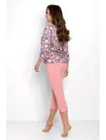Dámské pyžamo s elegantním střihem je dokonalou kombinací pohodlí a jemného stylu, ideální také jako domácí oblečení. Dvoudílná souprava se skládá z halenky s 3/4 rukávy a výstřihem do V pro ženský půvab a kalhot. Halenka je vyrobena z pružné přírodní tkaniny s bočními rozparky pro větší pohodlí. Kalhoty s délkou 7/8 a pravidelným střihem poskytují volnost pohybu, zatímco elastický pás zaručuje dokonalé přizpůsobení. Celkový design je zachován v jemných barvách s kvalitním potiskem látky na halence. Pyžamo má certifikát OEKO-TEX Standard 100, který zaručuje bezpečnost pro pokožku. Je navrženo a ušito v Polsku s ohledem na pohodlí a eleganci.