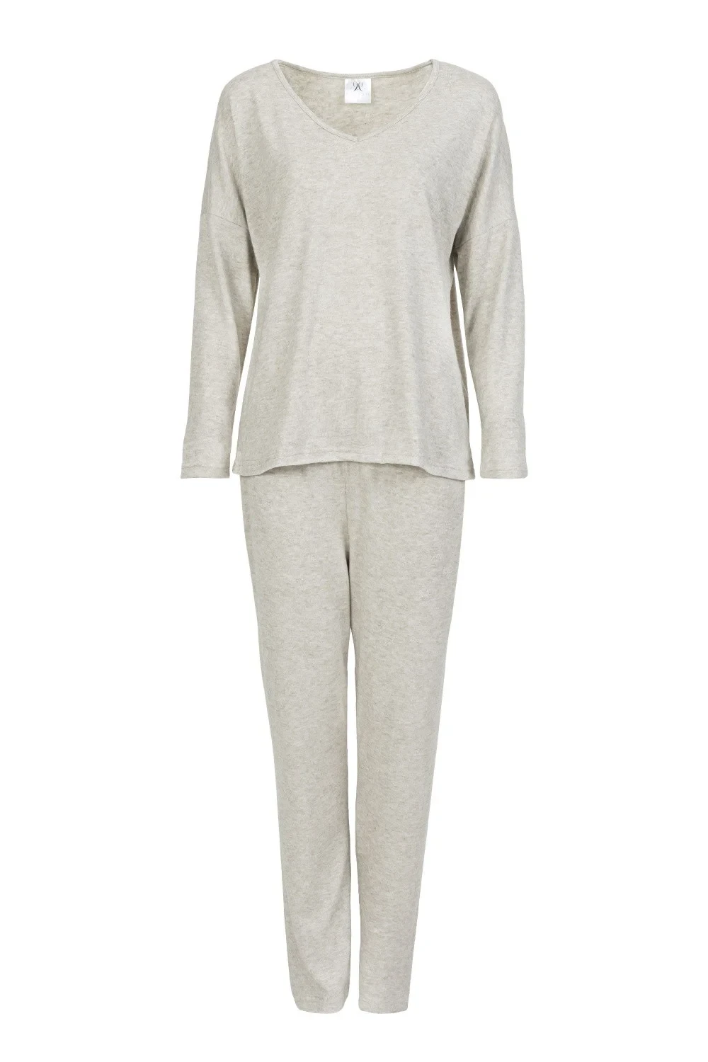 Dámský dvoudílný pyžamový set, který spojuje eleganci s maximálním pohodlím. Košile s dlouhým rukávem a V výstřihem byla navržena v nadměrném volném střihu, což z ní činí skvělou volbu pro ženy s větším poprsím, poskytující volnost a pohodlí při nošení. Hladká tkanina v jemných barvách dodává jemnost a eleganci, díky čemuž se pyžamo hodí i jako stylový domácí oděv. Kalhoty s dlouhými úzkými nohavicemi zdůrazňují postavu, a elastický pas zajišťuje ideální přizpůsobení každé postavě. Chybějící kapsy dodávají minimalistický charakter. Kvalitní jemný materiál zaručuje odolnost a pohodlí při nošení, vytvářejíc harmonický celek s košilí. Elegantní střih a regular fit činí tento set ideální volbou pro ženy, které ocení pohodlí, styl a všestrannost.
