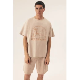 Mužský pyžamový set, který spojuje pohodlí s moderním stylem. Tričko s krátkým rukávem a kulatým výstřihem, zdobené módním potiskem, poskytuje volnost a pohodlí. Délka po kolena z něj činí ideální volbu na teplé noci. Krátké kalhoty s potiskem doplňují set, nabízejí lehkou, pohodlnou možnost pro relaxaci. Kalhoty jsou bez kapes, co jim dodává minimalistický charakter, a široký gumový pásek zajišťuje ideální přizpůsobení a pohodlí. Pyžamo je baleno v elegantní krabici, což z něj činí skvělý dárek. Ideální volba pro muže hledající spojení pohodlí a stylu ve svém nočním šatníku.
