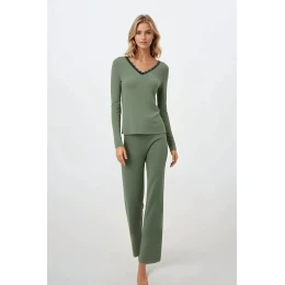 Pyžamo ve 2 dílech navržené s ohledem na eleganci a pohodlí. Výstřih do špičky, jemně zdobený krajkou, dodává ženský šarm a lehkost. Jemná barevnost a hladká látka vytvářejí harmonický celek, ideální k odpočinku a relaxaci. Horní část pyžama s dlouhým rukávem zakončeným elegantní manžetou zajišťuje pohodlí a styl, zatímco kalhoty bez kapes, ve strohém střihu a s gumou v pase, zaručují pohodlí a volnost pohybu. Dlouhé kalhoty zajišťují pohodlí v chladnějších nocích, a měkká a prodyšná látka z jemné viskózy zajišťuje pocit lehkosti a pohodlí po celou noc. Pyžamo je navrženo a ušito v Polsku z materiálů nejvyšší kvality, což z něj činí vynikající volbu jako dárek nebo elegantní domácí oděv.