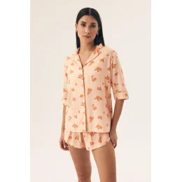 Elegantní dámský pyžamový set s decentními detaily ve formě lemování, který spojuje styl s pohodlím. Košile s krátkým rukávem, zapínání na knoflíky, s límečkem, vytváří klasický a zároveň pohodlný vzhled. Volný střih poskytuje volnost pohybu a materiál s potiskem jí dodává šarmu. Kraťasy bez kapes s širokým elastickým pasem zaručují pohodlí po celou noc. Vyrobeno z prodyšné pleteniny, ideální na teplé noci. Pyžamo je baleno v praktickém fóliovém sáčku, ideální jako dárek.