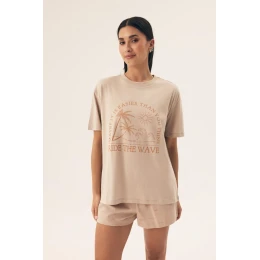 Elegantní dámská pyžama se skládá z trička s krátkým rukávem a polokruhovým výstřihem zdobeného módním potiskem a krátkých kalhotek s tímto potiskem. Volný a pohodlný střih zaručuje pohodlí během celé noci. Kalhotky nemají kapsy a široký elastický pás zajišťuje ideální přizpůsobení. Pyžamo je baleno v praktickém fóliovém sáčku, skvělé jako dárek nebo pro každodenní relaxaci doma.